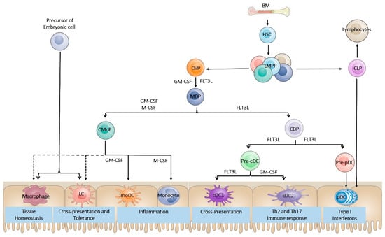 - Geissmann, F.; Manz, M.G.; Jung, S.; Sieweke, M.H.; Merad, M.; Ley, K. Development of monocytes, macrophages, and dendritic cells. Science 2010, 327, 656–661. [Google Scholar] [CrossRef] [PubMed]