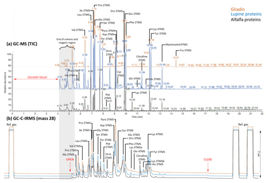 Gliadin was used directly from the commercial powder. Alfalfa and lupine seed proteins were extracted from 20 mg powder with 2 mL NaCl 5% and precipitated with 6 mL methanol. After centrifugation at 10,000× g for 10 min, the supernatant was discarded, and the protein isolate was dried. Hydrolysis was carried out in Ace pressure tubes with HCl 6 M at 110 °C for 16 h. The hydrolysate was dried under N2 flow, resuspended in 1 mL methanol:water (50:50 v:v), centrifuged and the supernatant was transferred into a 2 mL Eppendorf. Forty (40) µL were transferred to a vial (with insert) for GC-MS and spin-dried, the rest being spin-dried directly in the Eppendorf tube. Derivatization was done manually in the same tube by adding MSTFA (30 µL) in pyridine (20 µL), with 30 min (37 °C) incubation time. The derivatized extract was transferred into a vial for GC-C-IRMS.