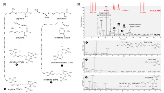 Arginine is very well-known to be transformed to compounds other than Arg 3TMS during silylation and, in particular, to form citrulline 3TMS. This is an important issue because proteins from Legume seeds are rich in Arg (about 30% of protein total N, Figure 2). Here, we checked the products of derivatization, because under our conditions, there was no methoxyamine (unlike in protocols used routinely for metabolomics). In principle, upon derivatization, Arg can form four products: Arg 3TMS, citrulline 3TMS (via the loss of one N atom) and ornithine (via the loss of the guanidium group), which can, in turn, generate two products: ornithine 3TMS and ornithine lactam 2TMS (Figure 4a). When derivatized and injected pure, Arg essentially formed ornithine 3TMS and ornithine lactam 2TMS, citrulline 3TMS being nearly negligible (Figure 4b, mass-28 trace in red). This is in clear contrast with GC-MS signals because ionisation efficiency of citrulline 3TMS is high and, thus, generated a signal as high as ornithine (Figure 4b, TIC trace in black). Interestingly, Arg 3TMS is negligible under such conditions. By contrast, it is significant when methoxyamine is added. Its retention time is very close to that of citrulline 3TMS (11.41 min). However, exact mass MS analysis clearly shows the appearance of fragments typical of Arg 3TMS, such as ion m/z at 187.10776, that are absent in citrulline 3TMS fragmentation (Figure S1).