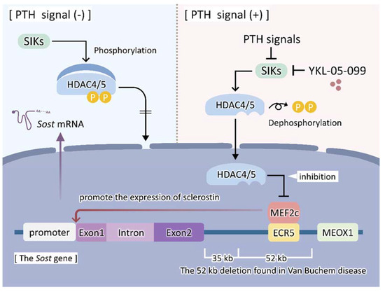 Structure of the Sost gene and effects of PTH on the expression of sclerostin. PTH signals suppress the expression of sclerostin. In the absence of PTH signals, salt-inducible kinase (SIK) 2 phosphorylates HDAC4/5 to promote the cytoplasmic retention of HDAC4/5. MEF2c binds to ECR5 (enhancer region) of the Sost gene to promote the expression of sclerostin. PTH signals inhibit the phosphorylation of HDAC4/5 by SIK2. Dephosphorylated HDAC4/5 remain in the nucleus and inhibit the transcriptional activity of MEF2c. YKL-05-099, a small-molecule SIK inhibitor, mimics the effects of PTH. PTH, parathyroid hormone; SIK, salt-inducible kinase; HDAC, histone deacetylase; MEF, myocyte enhancer factor; ECR, evolutionarily conserved region; MEOX1, mesenchyme homeobox 1.