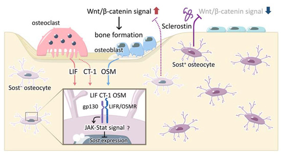 Roles of LIF, CT-1, and OSM in bone remodeling. Osteoclast-derived LIF, CT-1, and osteoblast-derived OSM inhibit the expression of sclerostin in osteocytes. These cytokines bind to gp130 and LIFR/OSMR, and may inhibit Sost expression via the JAK-Stat signal. The inhibition of sclerostin expression enhances Wnt/β-catenin signals in osteoblasts, which, in turn, promote bone formation. LIF, leukemia inhibitory factor; CT-1, cardiotropin-1; OSM, oncostatin M; LIFR, LIF receptor; OSMR, OSM receptor; JAK-Stat, janus kinase-signal transducer and activator of transcription.
