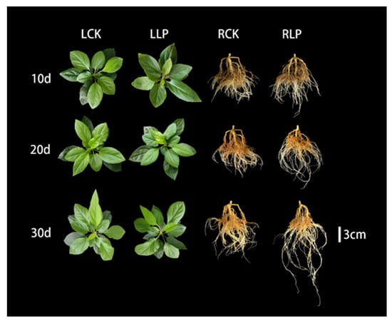 Morphological changes of leaves and roots when exposed to low−Pi treatment for different durations. (LCK: control leaves; RCK: control roots; LLP: Leaves under low−phosphorus treatment; RLP: Roots under low−phosphorus treatment).