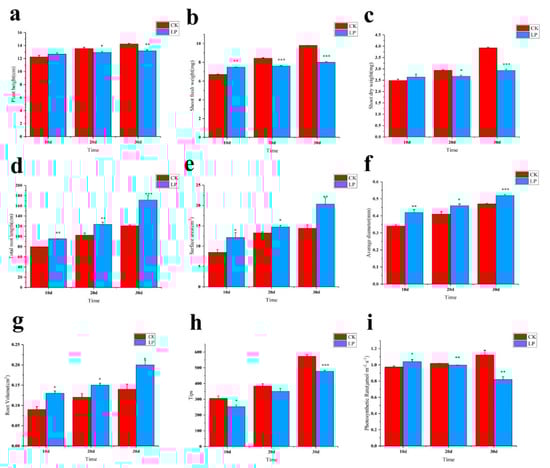 Effects of low−Pi treatment on growth parameters and photosynthetic rate of M. mandshurica. CK: control; LP: low−phosphorus treatment. (a) Plant height, (b) Shoot fresh weight, (c) Shoot dry weight, (d) Total root length, (e) Surface area, (f) Average diameter, (g) Root volume. (h) Tips. (i) Photosynthetic rate. The data were averaged from 15 seedlings, and an average (±standard error) was given for each parameter. According to the Tukey’s test, *** p < 0.01; ** p < 0.01−0.05; * p < 0. 1−0.05. The x−axis represents the processing time, and the y−axis represents the content of the measurement index. (All of the following are the same).