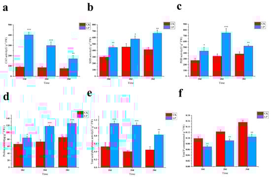 The changes of M. mandshurica leaves enzyme activity to low−Pi treatment. (a) CAT content, (b) SOD content, (c) POD content, (d) Proline content, (e) Acid phosphatase content, (f) Total phosphorus content. According to the Tukey’s test, *** p < 0.01; ** p < 0.01−0.05; * p < 0. 1−0.05. The x−axis represents the processing time, and the y−axis represents the content of the measurement index.