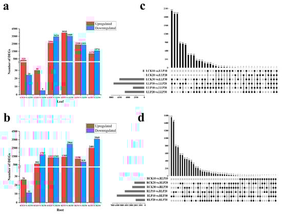 DEGs of under low−Pi stress. Statistics of up− and down−regulated DEGs in leaves (a) and roots (b) for each pairwise comparison. Venn diagrams of DEGs for control and low−Pi are in leaves (c) and roots (d). Red represents the DEGs number that is up−regulated, and blue represents the DEGs number that is down−regulated. The x−axis represents the difference comparison scheme for each group, and the y−axis represents the number of corresponding differential genes (DEGs).