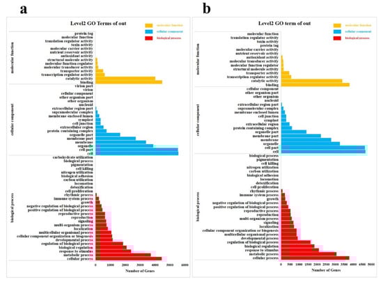 GO classification of DEGs. (a) Leaves; (b) Roots. The x−axis is the number of genes in the annotation, and the y−axis represents GO categories of gene function.