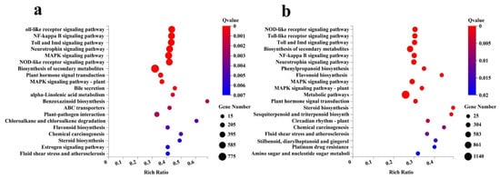 Enrichment of the KEGG annotation of the DEGs. (a) Leaves. (b) Roots. The x−axis represents the percentage of DEGs belonging to the corresponding pathway, and the y−axis represents the top 20 pathways. The sizes of bubbles represent the number of DEGs in the corresponding pathway, and the colors of the bubbles represent the enrichment Q−value of the corresponding pathway.