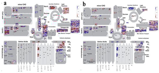 The Malus domestica was used as the reference genome to assess adaptation to low−Pi treatment in leaves and roots, and Madman soft (3.5.1R2) [,] was used to display a pathway overview of DEGs in response. The Mercator4 Tool and MapMan4 were used to compare the unigene sequences of 14,971 DEGs, yielding 11,761 MapMan BIN values and 2160 DEGs matched to this path in leaves. The Mercator4 Tool and MapMan4 were used to compare the unigene sequences of 10,880 DEGs, yielding 8670 MapMan BIN values and 1558 DEGs matched to this path in roots. The resulting file was loaded into the MapMan Image Annotator module to generate the metabolism overview map. The MapMan annotation depicts the overall changes in these DEGs metabolic pathways. Photorespiration, lipid metabolism, and the glycolysis process were mainly annotated to three pathways under low−Pi treatment in M. mandshurica (Figure 7).