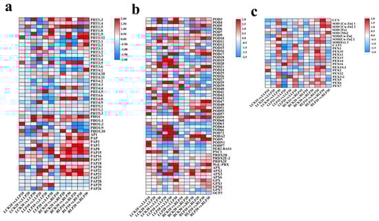 Heat map of DEGs related to phosphorus transport (a) and enzymes (b,c) under low−Pi treatment. The color red represents up−regulated expression, blue represents down−regulated expression, and the white represents that the value of log2 (FPKM+1) was zero.