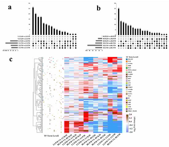 Analysis of differentially expressed TFs in M. mandshurica under low−Pi treatment. Venn diagram of (a) Leaves and (b) Roots. (c) Heat map of differential expression of TFs.