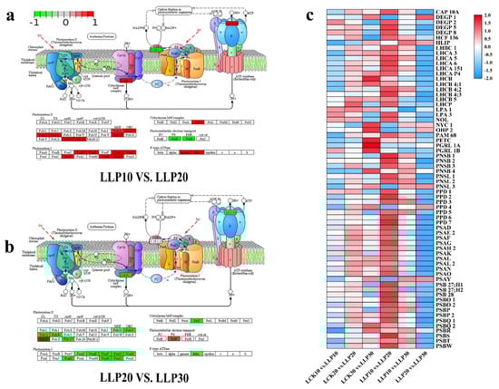 DEGs involved in the photosynthesis pathway of M. mandshurica leaves under low−Pi treatment. (a) LLP10 vs. LLP20 and (b) LLP20 vs. LLP30. (c) Heat map of photosynthesis related DEGs. Red represents up−regulated, blue represents down−regulated, and white represents the value of log2 (FPKM+1) was zero.