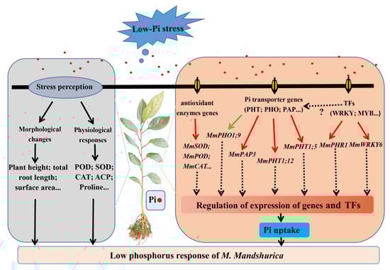 The response model of M. mandshurica to low−Pi stress. The red or green lines represent positive or negative effects, respectively; and the black or black dotted lines represent the progressive relationships or the unknowns, respectively.