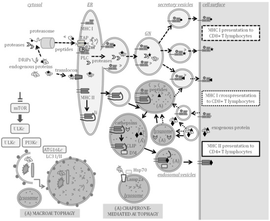 Major histocompatibility complex (MHC) class I and II antigen processing and presentation (APP) and autophagy. MHC class I presents endogenous peptides produced in the cytosol (peptide represented by a circle) or in secretory compartments (star) to CD8 + T lymphocytes through the pathways indicated with the dashed arrows. Endogenously synthesized proteins and defective ribosomal products (DRiPs) are processed to peptides in the cytosol by the proteasome and cytosolic proteases. Peptides are then transported by transporter associated to antigen processing (TAP) to the ER where the peptide loading complex (PLC) is formed by a peptide, TAP, MHC class I, β2-microglobulin (β2m) and other assistant proteins. Endogenous proteins can enter the lumen of the ER through the translocon and be processed by proteases of the ER or the Golgi network (GN), thus, producing peptides that can also be loaded on MHC class I beyond the ER. Loaded MHC class I molecules are transported to the cell surface in secretory vesicles. MHC class I can also cross present peptides and prime CD8+ T lymphocytes through the pathway indicated with the dotted arrows. Cross-presented peptides (triangle) are produced by processing exogenous antigens in the cytosol or in secretory or endocytic compartments in which autophagy (A) may take place. MHC class II presents peptides (diamond) processed from exogenous proteins to CD4 + T lymphocytes through the pathway indicated with the continuous lined arrows. In the ER, MHC class II molecules are assembled and bind to the invariant chain li. The MHC class II is exported to endosomal compartments, in which autophagy can take place and where class II-associated invariant chain peptide (CLIP) remains bound to MHC class II after cleavage of li by lysosomal cathepsins. HLA-DM assists in the exchange of CLIP by a peptide that is exported to the cell surface through exocytic vesicles. Chaperone-mediated autophagy allows the targeting of cytosolic proteins to be degraded in lysosomes and is assisted by Lamp2a, Hsp70 and other chaperones. Macroautophagy is the engulfment of diverse cytosolic material to be degraded, induced by inhibition of the mammalian target of rapamycin (mTOR). Several multiprotein complexes (ULK, PI3K and ATG16L1) are involved in the formation of vesicles and lipidation of LC3-I to LC3-II, thereby, forming autophagosomes that fuse with lysosomes.