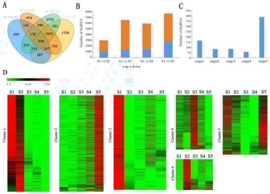 Identification and analysis of differentially expressed lncRNAs. (A) The distribution of DELs in each comparison group. (B) Statistical results of the up-regulated or down-regulated DEL numbers in each control group. (C) The statistical results of the stage-specific DEL numbers. (D) K-means clustering results of DELs.