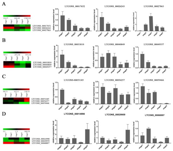 The expression patterns of 12 randomly selected DELs were verified by qRT-PCR. The heatmaps represent the transcription expression (FPKM) and the column diagram represents the relative expression levels. (A) The expression patterns of LTCONS_00017652, LTCONS_00026243, and LTCONS_27863. (B) The expression patterns of LTCONS_00033810, LTCONS_00040849, and LTCONS_00049357. (C) The expression patterns of LTCONS_00053185, LTCONS_00056257, and LTCONS_00059466. (D) The expression patterns of LTCONS_00014998, LTCONS_00029959, and LTCONS_00068897. Bar = means +/− SD from three biological repeats.