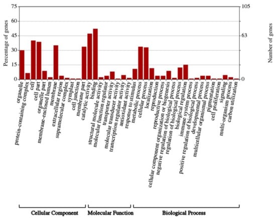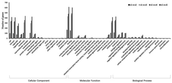 The function of lncRNAs can be realized by cis acting on target genes. The lncRNAs located within 10 kb upstream or 20 kb downstream of protein-coding genes on the same chromosome are searched, as the cis-acting mode and the adjacent mRNA is screened out as its target gene. A total of 2579 DELs may regulate 2367 protein-coding genes through the cis-acting mode (Table S2). Approximately 306 lncRNAs can regulate multiple target genes and 421 mRNAs were cis-regulated by at least two lncRNAs. To further comprehend the function of these DELs, GO annotations were performed on their target genes. A total of 17,12, and 19 GO terms were contained in the cellular component, molecular function, and biological processes (Figure 4). The most enriched GO terms were the membrane, binding, and cellular process, respectively. Moreover, a large number of target genes were annotated in GO terms as a response to stimulus, developmental process, reproductive process, and growth, which indicated the corresponding lncRNAs of these target genes might participate in the receptacle development process and reproductive process of N. nucifera (Figure 4).