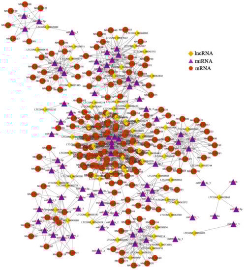 LncRNA can act as the endogenous target mimics (eTMs) for miRNAs and compete with mRNAs to relieve their degradation by miRNAs. To further clarify the regulatory relationship between miRNA, mRNA, and lncRNA during the floral thermogenesis process, the miRanda algorithm was used to predict the interaction between 289 miRNAs and 9415 transcripts in the present study. A total of 75 DELs were predicted as eTMs for miRNA (Table S4). Meanwhile, 182 known mRNAs and 73 known miRNAs were also contained in the lncRNA–miRNA–mRNA interaction network (Figure 6). A large number of known miRNAs are associated with temperature response and the flower development process, such as miR159, miRNA160, miR164, miR169, miR166, miRNA167, and miR319. In the interaction network, the majority of lncRNAs have a weaker ability to bind corresponding miRNA than those of mRNAs. For example, the prediction results indicate that miR160a-5p has 19 targets, including 3 lncRNAs and 16 mRNAs. MiR168 has 18 targets, including 4 lncRNAs and 14 mRNAs (Table S4). The number of mRNAs binding to the same miRNA was more than that of lncRNA. In addition, several different miRNAs can simultaneously regulate the same target. For example, miR168, miR168a-5p, and miR168b_1 can synchronously regulate the expression of LTCONS_00061945, LTCONS_0009617, LTCONS_0009616, LTCONS_0009615, and NNU_05277 (Figure 6). The analysis of genes involved in the lncRNA–miRNA–mRNA interaction network revealed that 16 mRNAs related to floral thermogenesis could compete with 70 lncRNAs for binding 29 miRNAs (Table S4). Moreover, the number of mRNAs binding to the same miRNA was less than that of lncRNA. For example, 7 transcripts were predicted as the targets of miR169a-5p, including 6 lncRNAs and 1 mRNA (NNU_07790-RA).