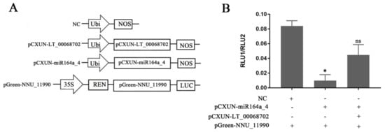 Dual-luciferase reporter assay. (A) Schematic diagram of pCXUN and pGreenII-0800-LUC vector. (B) The interaction results of LTCONS_00068702-miR164A_4-NNU_11990 by the double-luciferase reporter gene assay. * Represents the significant difference between the experimental and control groups using one-way ANOVA (* p value < 0.05); ns stands for “not significant”. NOS, terminator; Ubi, ubiquitin promoter; REN, Renilla luciferase; LUC, firefly luciferase.