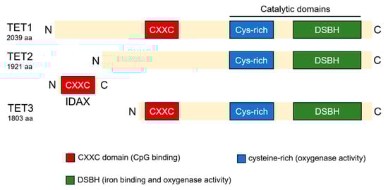 The human TETs are long proteins, with 2039 amino acids (aa) in TET1, 1921 aa in TET2, and 1803 aa in TET3 []. All three members consist of a cysteine-rich region at the N-terminus and a double-stranded β-helix domain (DSBH) at the C-terminus []. The catalytic domains of all three TETs are situated in C-termini []. The DSBH domain is responsible for iron binding and is associated with the oxygenase activity of TET proteins [,]. A sequence analysis revealed high similarity between TET1 and the C-terminal domain of Saccharomyces cerevisiae RNA polymerase II, which regulates RNA polymerase II activity through protein methylation, suggesting a role of TET1 in regulating post-translational modifications []. Different from TET2, both TET1 and TET3 contain a DNA-binding zinc finger cysteine-X-X-cysteine (CXXC) domain in their N-terminus, which is thought to recognize unmethylated CpGs and is essential for their functions []. However, due to a chromosomal inversion, TET2 does not contain a CXXC domain, which is compensated for its neighboring gene, the “inhibition of the Dvl and AXin complex” (IDAX), and is responsible for recruiting TET2 to DNA []. The structure of TET proteins is demonstrated in Figure 1.