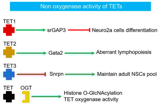 Although the main function of the TET protein was considered to be oxygenase activity dependent gene expression regulation, emerging studies have determined the importance of the non-catalytic function of TETs [,] (Figure 2). For example, TET1 can promote the expression of srGAP3, independent of its enzymatic activity, and negatively regulates the neuronal differentiation of Neuro2a cells []. Recent research using TET2 catalytically inactive mice showed the significance of the non-catalytic role of TET2 in the hematopoietic system []. Besides, the essential role of TET3 in maintaining the adult neural stem cell (NSC) pool is believed to be non-catalytic and acts through its direct binding to the target gene, Small ribonucleoprotein-related polypeptide N (Snrpn) []. Furthermore, studies have established interaction between TETs-mediated epigenome and O-linked N-acetylglucosamine (O-GlcNAc) transferase (OGT)-mediated metabolism [,,,]. The catalytic domain of TET2 can directly interact with OGT, which is required for histone O-GlcNAcylation and is unrelated to TET2 oxygenase activity []. Meanwhile, the interaction between TET1 and OGT can promote TET1 activity during development and disease [,,]. These observations indicate the complex dual activities of TETs in regulating gene expression and can be implicated in designing strategies for targeting TETs in disease treatment.