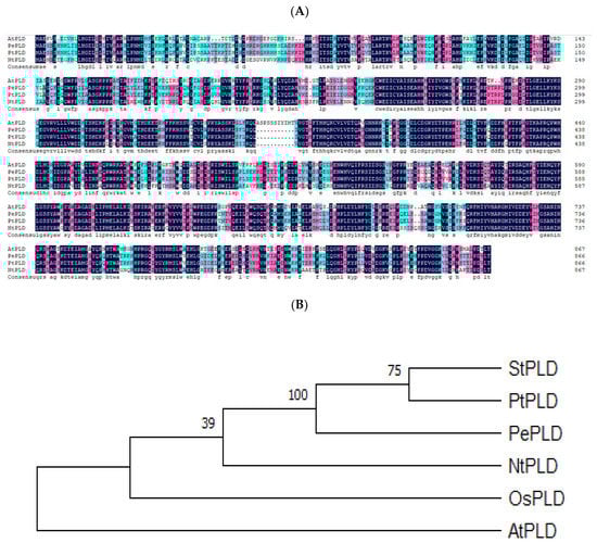 In this study, a phospholipase Dδ gene, PLDδ, was cloned from P. euphratica leaves. The amino acid sequences were compared with PLDδ proteins from different plant species. The PePLDδ sequence displayed a high similarity to P. tricocarpa PLDδ (Figure 1A). The comparative phylogenetic analysis revealed that PePLDδ displayed a homology to StPLDδ and PtPLDδ, but was distinct from AtPLDδ (Figure 1B).