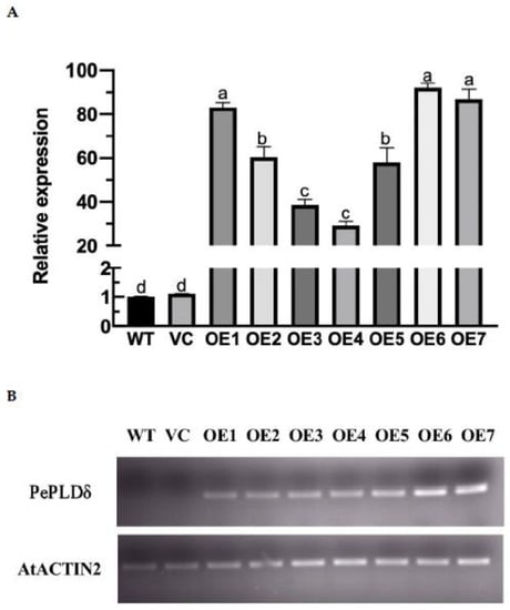 Seven transgenic lines, OE1, OE2, OE3, OE4, OE5, OE6 and OE7, were obtained by transferring the PePLDδ gene into Arabidopsis thaliana. The transgenic lines were identified with semi-quantitative reverse transcription PCR and real-time quantitative PCR (Figure 2). The wild-type (WT) Arabidopsis, empty vector control (VC) and two transgenic lines (OE6 and OE7) that showed the highest abundance of PePLDδ were used for salt treatments.