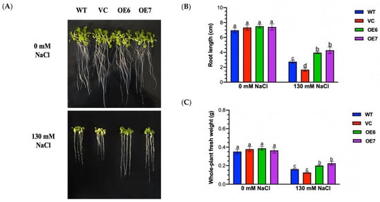 The change in growth can sensitively reflect the plant’s ability to adapt to a salt environment []. The root length and whole plant weight of all tested genotypes were compared. The root length of WT, VC and PePLDδ-transgenic lines, OE6 and OE7, significantly decreased upon seven days of 130 mM NaCl treatment (Figure 3A,B). The restriction of NaCl was more pronounced in WT and VC than in transgenic plants (Figure 3A,B). Moreover, the whole-plant fresh weight of salt-stressed WT and VC showed a 10–31% higher reduction than transgenic lines (Figure 3C). Our results showed that there was no significant difference between the tested lines, WT, VC and transgenic Arabidopsis, in root growth and fresh weight under no-salt conditions (Figure 3).