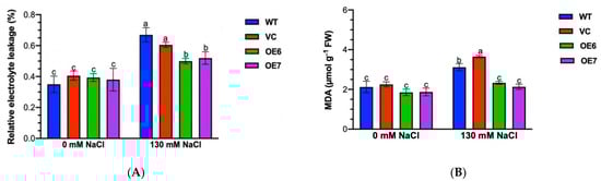 To test the salt damage effect on cell membrane integrity, the relative electrolyte leakage (EL) of control and salinized plants was examined []. Compared with WT and VC, PePLDδ-overexpressed Arabidopsis exhibited a 12–27% lower relative EL after 12 h of salt treatment (Figure 4A). Therefore, PePLDδ could alleviate the damage of high NaCl on the cell membrane and consequently improved the salt tolerance of transgenic Arabidopsis.