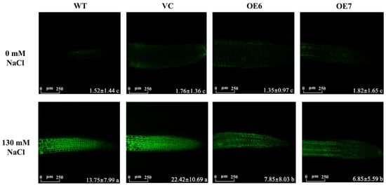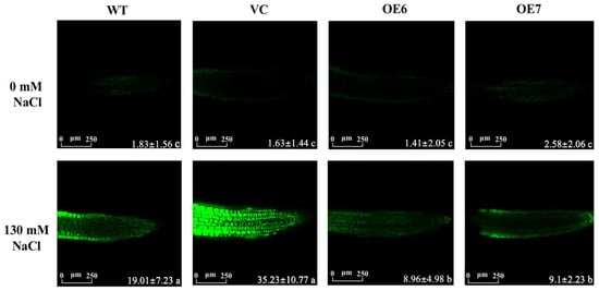 Reactive oxygen species (ROS) cause membrane peroxidation and electrolyte leakage under salt stress [,,]. We used the fluorescent probe, H2DCFDA, to detect salt-elicited H2O2, as the fluorescence intensity of intracellular DCF is positively correlated with the level of intracellular H2O2 []. The intensity of H2DCFDA showed that H2O2 levels were almost undetectable in the no-salt controls of all tested genotypes. After high salt treatment, the H2O2 level in WT and VC markedly increased in root cells, which was significantly higher than transgenic lines, OE6 and OE7 (Figure 5).