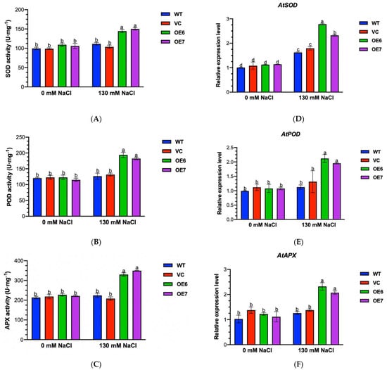 The high levels of H2O2 in WT and VC mainly result from the decreased ability to scavenge ROS in salt-stressed plants [,,]. To confirm whether the PePLDδ-transgenic lines had the capacity to maintain ROS homeostasis, the activity and transcription of antioxidant enzymes, including ascorbic acid peroxidase (APX), peroxidase (POD) and superoxide dismutase (SOD), were testified in this study. After NaCl treatment (130 mM, 7 d), the total activities of tested antioxidant enzymes, SOD, POD and APX, increased by approximately 50% in OE6 and OE7, whereas the salt stimulation was less pronounced in WT and VC (Figure 6A–C). In accordance, the expression of AtSOD, AtPOD and AtAPX genes showed a higher increase in PePLDδ-overexpressed plants compared to WT and VC, similar to the trend of enzymic activity (Figure 6D–F).
