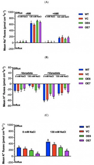 Na+, K+ and H+ fluxes in Arabidopsis roots were recorded with non-invasive micro-test technique (NMT-YG-100, Younger USA, LLC, Amherst, MA 01002, USA) equipped with selective microelectrodes for target ions [,,]. Seven-day-old Arabidopsis seedlings of WT, VC and PePLDδ-overexpressed lines (OE6 and OE7) were exposed to 0 or 130 mM NaCl for 12 h. Then, Arabidopsis roots were incubated with amiloride (an inhibitor of Na+/H+ antiporter, 0 or 5 mM) or sodium orthovanadate (an inhibitor of plasmalemma H+-ATPase, 0 or 500 μM) for 30 min. Thereafter, roots were sampled and equilibrated for 30 min in the basic solution containing 0.1 mM NaCl, 0.1 mM CaCl2, 0.1 mM MgCl2, 0.5 mM KCl and 2.5% sucrose (pH 5.8). Na+, H+ and K+ fluxes were monitored by NMT microelectrodes at the meristematic region (200 μm from the root tip) and continuously recorded for 10 min.