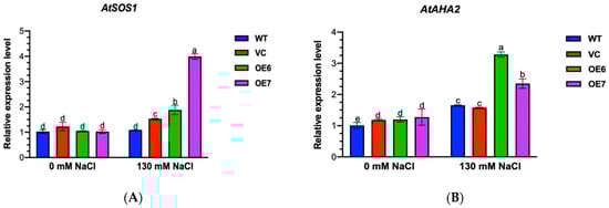 It has been shown that the activated plasmalemma H+-ATPase and Na+/H+ antiporter result, at least in part, from the upregulated transcription of encoding genes [,,,]. Here, we examined the abundance of a typical Na+/H+ antiporter gene, SOS1, and a H+-ATPase gene, AHA2, in Arabidopsis plants. We observed that the transcription of AtSOS1 and AtAHA2 was significantly up-regulated in all tested lines under a high salt treatment (with the exception of AtSOS1 in WT) (Figure 9A,B). It is worth noting that the salt-enhanced gene expression was more pronounced in the PePLDδ-overexpressed plants than in the WT and VC (Figure 9A,B). The results support the finding of a high Na+/H+ exchange in the roots of PePLDδ-transgenic plants (Figure 8A).