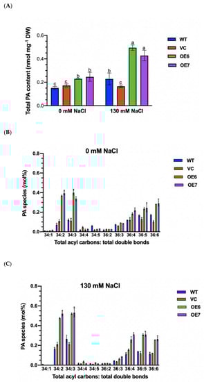 Phosphatidic acid (PA) content in wild-type (WT) Arabidopsis, empty vector control (VC) and transgenic lines overexpressing PePLDδ under NaCl stress. Seeds from WT, VC and PePLDδ-overexpressed lines (OE6 and OE7) were allowed to germinate on 1/2 MS medium and grown for seven days. Then, seedlings were transferred to liquid medium containing 0 or 130 mM NaCl for 24 h. Control and stressed seedlings were harvested, and PA species were measured using electrospray ionization–tandem mass spectrometry (ESI-MS/MS). (A) Total PA content. (B,C) PA species (34:1, 34:2, 34:3, 34:4, 34:4, 34:5, 36:2, 36:3, 36:4, 36:5, 36:6) in the absence (0 mM) and presence of NaCl (130 mM). Data are presented as the mean of three individual plants, and error bars represent SE. Columns with different letters, a, b and c (A) and asterisks (*) (B) show significant differences, with p < 0.05.
