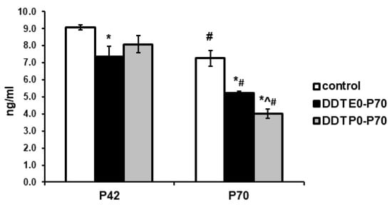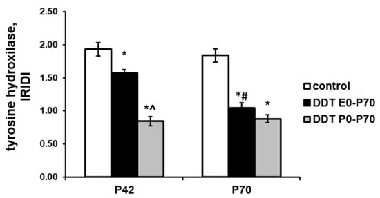 Changes in immunoreactivity intensity distribution index (IRIDI) for tyrosine hydroxylase in epinephrine-producing cells after developmental exposure to low doses of o,p’-DDT. Data are shown as mean ± S.E.M. P, day of postnatal development; p < 0.05 compared to the control (*), compared to the group DDT E0-P70 (^), compared to P42 (#).