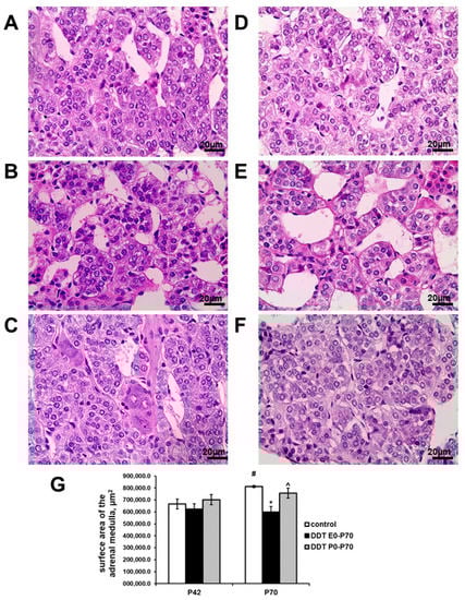 After puberty, the adrenal medulla of the control rats had significantly increased surface area compared to samples taken from prepubescent rats (Figure 2G). The chromaffin cells had less intensive basophilic staining than in pubertal age (Figure 2D). Unlike the control, prenatally and postnatally exposed rats showed no age-related increase in adrenal medulla size. Their adrenal medulla surface area was 25% smaller than the control values (Figure 2G). Postnatally exposed rats showed a slight increase in medulla size with age, although the surface area of their adrenal medulla did not significantly differ from the control (Figure 2G). No principal changes in adrenal medulla histology of the DDT-exposed rats were found (Figure 2E,F).