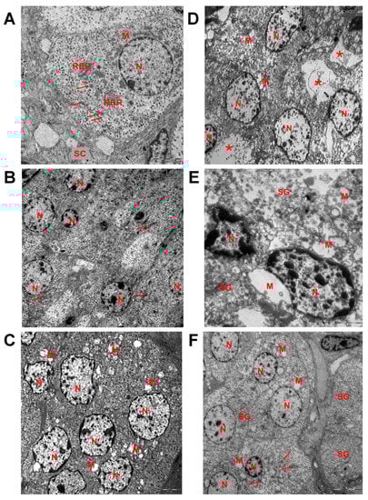 Epinephrine-producing cells of the adrenal medulla of the control and the exposed to low doses of o,p’-DDT rats. Transmission electron microscopy. Fine structure of the epinephrine-producing cells of the control rats (A), prenatally and postnatally exposed to DDT rats (B) and postnatally exposed to DDT rats (C) in pubertal period (P42), of the control rats (D), prenatally and postnatally exposed to DDT rats (E) and postnatally exposed to DDT rats (F) after puberty (P70). M, mitochondria with swollen matrix; N, nucleus; SG, secretory granules, RER, rough endoplasmatic reticulum; arrows point unaffected mitochondria, asterisks–foci of devastation of cytoplasm. Scale bars 5 µm for (A,C,D), 10 µm for (B,E), 2 µm for (E).