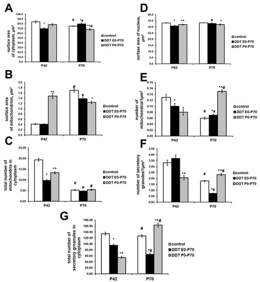 Changes in fine structure of the epinephrine-producing cells after developmental exposure to low doses of o,p’-DDT. Surface area of cytoplasm (A), surface area of nucleus (B), surface area of mitochondrion (C), number of mitochondria per 1 μm2 of cytoplasm (D), total number of mitochondria in cell (E), number of secretory granules per 1 μm2 of cytoplasm (F) total number of mitochondria in cell (G). Data are shown as mean ± S.E.M. P, day of postnatal development; p < 0.05 compared to the control (*), compared to the group DDT E0-P70 (^), compared to P42 (#).