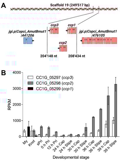 Cocaprin-encoding genes form a tandem array in the genome of C. cinerea strain AmutBmut and show developmental regulation. (A) Representation of the cocaprin locus on scaffold 19 with arrowhead and colors indicating the direction of transcription. Boxes show the location of exons; (B) Mean RPKM (Reads Per Kilobase of transcript per Million mapped reads, n = 2) corresponding to 13 developmental stages in C. cinerea strain AmutBmut for ccp1, ccp2 and ccp3 []. Standard deviations are shown as error bars. My: Vegetative mycelium, Knot: Hyphal knots with vegetative mycelium, sPri: Small fruiting body primordia, 0 h Pri: Fruiting body primordia at 0 h, 12 h Pri: Fruiting body primordia at 12 h after the trigger light, 24 h Cap: Cap at 24 h after the trigger light, 24 h Stipe: Stipe at 24 h after the trigger light, 30 h Cap: Cap at 30 h after the trigger light, 30 h Stipe: Stipe at 30 h after the trigger light, 36 h Cap: Cap at 36 r after the trigger light, 36 h Stipe: Stipe at 36 h after the trigger light, 39 h Cap: Cap at 39 h after the trigger light and 39 h Stipe: Stipe at 39 h after the trigger light.