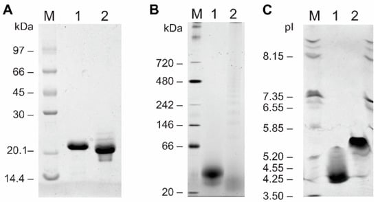 4.4. SDS-PAGE, Native-PAGE, and Isoelectric Focusing
