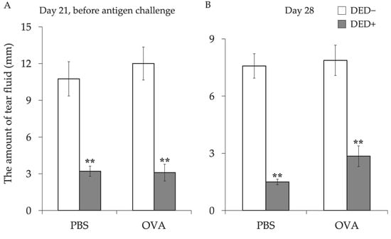 Tear volume before and after induction of AC in mice with or without dry eye (DED). The amount of tear fluid was measured at day 21 before antigen challenge (A) and at day 28 (B). The length of the wet thread is shown as means ± standard error of the means in each group. Four experimental groups were compared: control (n = 6), DED (n = 6), allergy (n = 6), and allergy with DED (n = 5). ** p < 0.01 (Tukey–Kramer test) versus non-allergy control group. PBS, mice challenged with phosphate-buffered saline (PBS) (non-allergy group); OVA, mice challenged with ovalbumin (OVA) (allergy-induced group); DED, mice with excised extraorbital lacrimal glands.