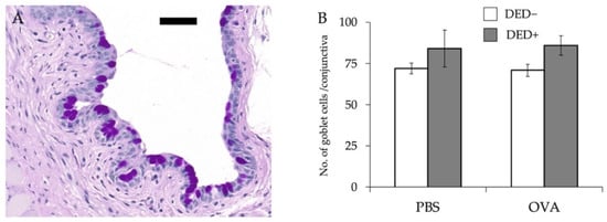 Number of goblet cells in the conjunctiva. The eyes were isolated for histological analysis; the number of goblet cells in the epithelium of the conjunctiva was counted on day 29. Representative photo of conjunctiva and goblet cells showing a purple-magenta periodic acid–Schiff-positive reaction (A). Data are shown as means ± standard error of the means in each group (B). Four experimental groups were compared: control (n = 6), DED (n = 6), allergy (n = 6), and allergy with DED (n = 5). PBS, mice challenged with phosphate-buffered saline (PBS) (non-allergy group); OVA, mice challenged with ovalbumin (OVA) (allergy-induced group); dry eye disease (DED), mice with excised extraorbital lacrimal glands. Bar, 50 μm.