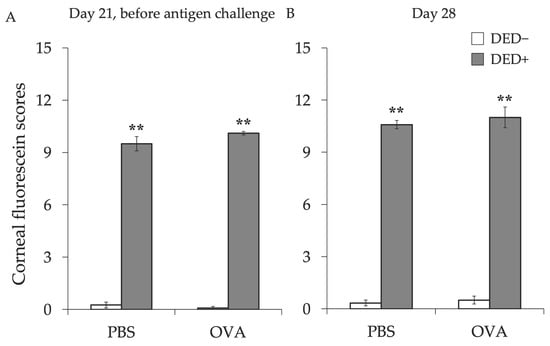 Corneal staining score before and after the induction of AC with or without dry eye (DED). Corneal fluorescein score was classified at day 21 before antigen challenge (A) and at day 28 (B). The sum of the scores is shown as means ± standard error of the means in each group. Four experimental groups were compared: control (n = 6), DED (n = 6), allergy (n = 6), and allergy with DED (n = 5). ** p < 0.01 (Tukey–Kramer test) versus non-allergy control group. PBS, mice challenged with phosphate-buffered saline (PBS) (non-allergy group); OVA, mice challenged with ovalbumin (OVA) (allergy-induced group); DED, mice with excised extraorbital lacrimal glands.
