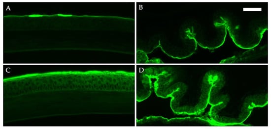 To assess the epithelial barrier function, we performed an LC-biotin assay. LC-biotin has been reported to cross-link proteins and not penetrate intact tight junctions, and we followed a previously reported method []. LC-biotin (Thermo Fisher Scientific, Waltham, MA, USA) in PBS (1 mg/mL; 5 µL) was administered 30 min prior to eye harvest. Frozen sections were cut into 7 µm slices and fixed with 4% paraformaldehyde (Nacalai Tesque, Inc., Kyoto, Japan) for 10 min at room temperature. The cells were then washed with PBS and incubated with streptavidin Alexa Fluor 488 conjugate (Thermo Fisher Scientific) for 1 h at room temperature, washed with PBS, and mounted with the VECTIRSHIELD mounting medium containing DAPI (Vector Laboratories, Inc., Burlingame, CA, USA).