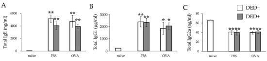 Serum IgE (A), IgG1 (B), and IgG2a (C) levels of mice. Serum IgE and IgG levels were evaluated 24 h after the last antigen challenge. Data are shown as means ± standard errors of the means in each group. Four experimental groups were compared: control (n = 6), DED (n = 6), allergy (n = 6), and allergy with DED (n = 5). * p < 0.05; ** p < 0.01 (Dunnett’s test) versus naïve mice. PBS, mice challenged with phosphate-buffered saline (PBS) (non-allergy group); OVA, mice challenged with ovalbumin (OVA) (allergy-induced group); dry eye disease (DED), mice with extraorbital lacrimal gland excision.