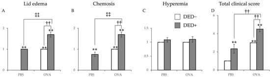 Clinical signs were measured at 20 min after first antigen challenge at day 21. Scores are shown as means ± standard errors in each group. Four experimental groups were compared: control (n = 6), DED (n = 6), allergy (n = 6), and allergy with DED (n = 5). ** p < 0.01 (Tukey–Kramer test) versus non-allergy control group; †† p < 0.01 (Tukey–Kramer test) versus allergy-induced group; ‡‡ p < 0.01 (Tukey–Kramer test) versus non-allergy dry eye disease (DED) group.