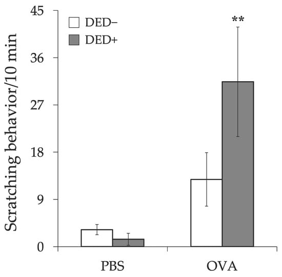 Number of scratching episodes. The scratching behavior of the mice was counted for 10 min after first antigen challenge at day 21, and the number of scratching episodes by the hindlimb was counted. The number of scratching episodes is shown as means ± standard error in each group. Four experimental groups were compared: control (n = 6), DED (n = 6), allergy (n = 6), and allergy with DED (n = 5). ** p < 0.01 (Tukey–Kramer test) versus non-allergy control group. PBS, mice challenged with phosphate-buffered saline (PBS) (non-allergy group); OVA, mice challenged with ovalbumin (OVA) (allergy-induced group); dry eye disease (DED), mice with excised extraorbital lacrimal glands.