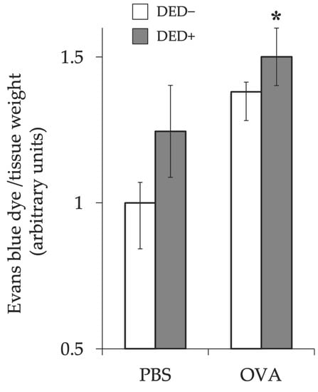 Evans blue dye leakage in conjunctiva. Dye leakage was evaluated 30 min after antigen challenge at day 28, shown as arbitrary units ± standard error in each group. Four experimental groups were compared: control (n = 6), DED (n = 6), allergy (n = 6), and allergy with DED (n = 5). * p < 0.05 (Tukey–Kramer test) versus non-allergy control group. PBS, mice challenged with phosphate-buffered saline (PBS) (non-allergy group); OVA, mice challenged with ovalbumin (OVA) (allergy-induced group); dry eye disease (DED), mice with excised extraorbital lacrimal glands.