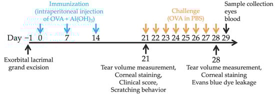 Experimental AC was induced using a previously described protocol with slight modifications [] (Figure 9). Briefly, mice were injected intraperitoneally three times with 30 µg ovalbumin (OVA) (Worthington Biochemical Corp, NJ, USA) mixed with 1 mg of Imject Alum (Thermo Fisher Scientific, MA, USA) at intervals of 7 days. Seven days after the third sensitization, both eyes of each mouse were challenged with OVA in PBS (1 mg per 5 µL per eye) from day 21 to day 28.
