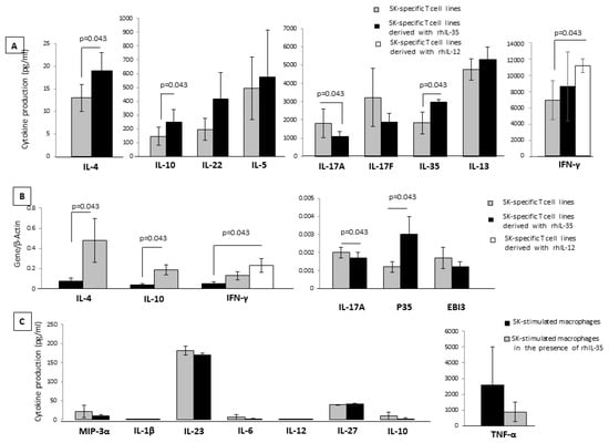 Ten T-cell lines specific for SK generated in the presence and absence of rh IL-35 in bulk PBMC cultures were analyzed for the ability to produce IFN-γ, IL-4, IL-13, IL-10, IL-22, IL-17A, IL-17F, IL-35, and IL-5 in response to PMA plus anti-CD3 mAb with a multiplex bead-based assay. When the T-cell lines were generated with rIL-12, the levels of IFN-gamma increased (p = 0.043) (Figure 1A), suggesting that the culture conditions were satisfactory for the modulation of T-cell lines. As shown in Figure 1, the production of the two Th2-type cytokines, IL-4 and IL-10, and IL-35 production were significantly increased, whereas the production of the Th17-type cytokine, IL-17A, was significantly decreased when SK-specific T-cell lines were generated in the presence of IL-35 compared to SK-specific T-cell lines generated in the absence of IL-35. No significant effect of rh IL-35 on the production of IFN-gamma was observed (Figure 1A), and no effects of rhIL-35 on the production of the other two Th17-type cytokines, IL-17F and IL-22, or the other two Th2-type cytokines, IL-13 and IL-5, were observed (Figure 1A).