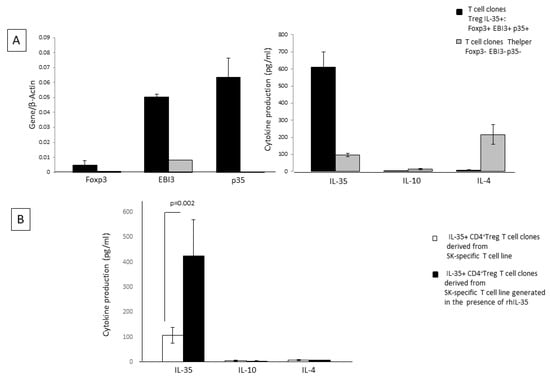 Besides the CD4+T-cell clones derived from SK-specific T-cell lines generated in the presence of rhIL-35 and in the absence of rhIL-35, which did not express mRNA for Foxp3 and p35 but expressed mRNA for EBI3 and produced IL-10, IL-4, and IL-35 (Figure 3A), we found CD4+ T-cell clones expressing Foxp3, EBI3, p35, STAT1, and STAT4 (two well-known transcription factors expressed by regulatory T cells expressing IL-35) and producing IL-35 but not IL-10 or IL-4 (Figure 3A). The percentage of Treg-type IL-35+, IL-10-, IL-4- T-cell clones derived from SK-specific T-cell lines generated in the presence of rhIL-35 was not significantly higher (11/41 = 27%) than the percentage of Treg-type T-cell clones derived in the absence of rhIL-35 (5/27 = 18.5%). However, these Treg clones, derived from SK-specific T-cell lines generated in the presence of rhIL-35, produced levels of IL-35 that are significantly higher than those produced by Treg clones derived from SK-specific T-cell lines generated in the absence of rhIL-35 (p = 0.002) (Figure 3B). Thus, rhIL-35 seems to stimulate the production of IL-35 by Foxp3+ Treg cells, which do not produce IL-4 and IL-10 but, does not induce the expansion of the IL-35+ Treg cells.